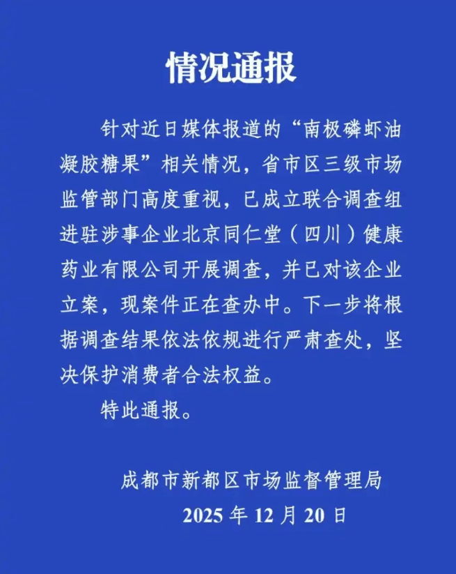 12月25日,市场监管总局针对此事作出正式回应,直指行业委托生产乱象的核心问题,原文如下:“‘南极磷虾油’事件暴露出企业委托生产加工行为不规范等问题。一些企业借助企业品牌影响力,仅关注销售利润却不对产品质量进行把关,甚至纵容被委托企业制售不合格产品。据介绍,市场监管总局近期将发布《食品委托生产监督管理办法》,将商标授权、特许经营、来料加工、定制生产等方式进行委托生产食品的情形纳入监督管理,明确细化委托双方食品安全责任,健全相关监管制度要求。市场监管总局将指导地方市场监管部门,加强对类似同仁堂贴牌加工等方式委托生产食品行为的监管。近期将组织开展专项抽检,对市场上的磷虾油、鱼油等产品加大监督抽检力度,严厉打击相关违法行为。”