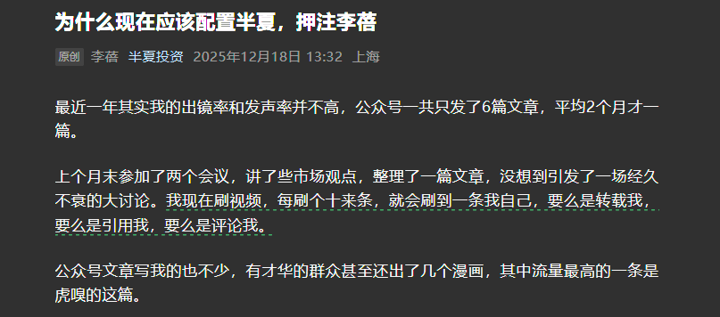 值得注意的是,半夏投资官方公众号近日发布文章《为什么现在应该配置半夏,押注李蓓》。文章写道: