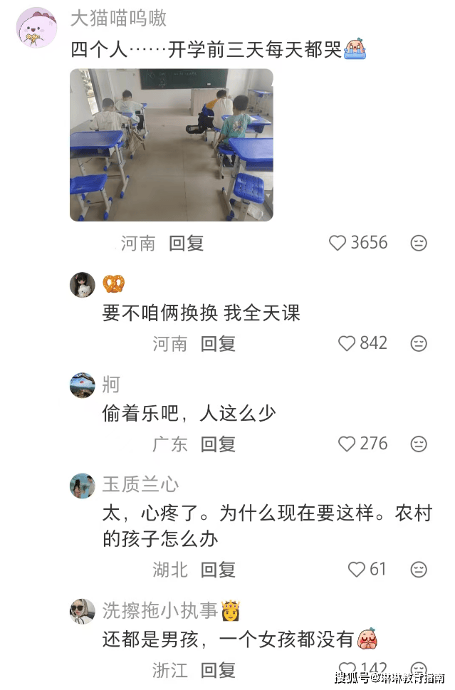 更令人心酸的是,这并非个例,而是一种普遍现象,评论区有一位在河南农村担任小学老师的网友无奈吐槽:一个班级只有4个学生,开学前三天每天都哭。