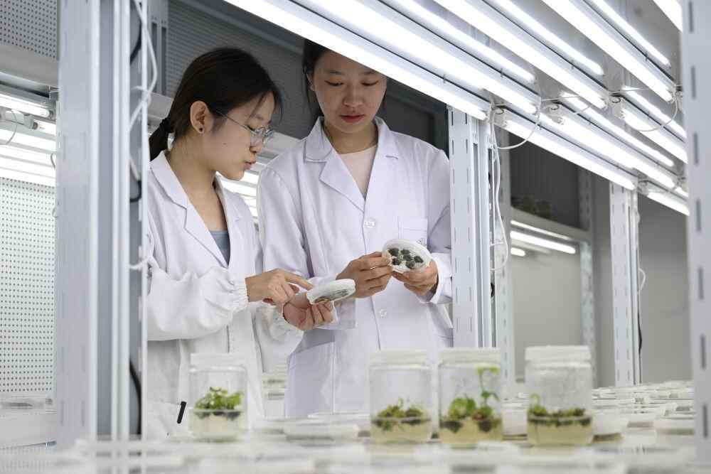 2025年7月6日,研究人员在位于安徽省宿州市的黄淮海(宿州)种业科技谷南京农业大学大豆生物育种中心人工气候室观察育种材料生长情况。 新华社记者 黄博涵 摄