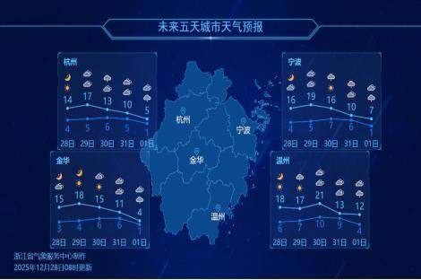 然而,12月31日至1月1日,受低涡切变和高空槽东移影响,全省将迎来强冷空气过程,伴有明显降水、降温和大风。2026年1月1日,浙西和浙北山区局部有雨夹雪或小雪。1月2日雨止,全省转阴到多云,最低气温持续下降,体感从湿冷转为晴冷。