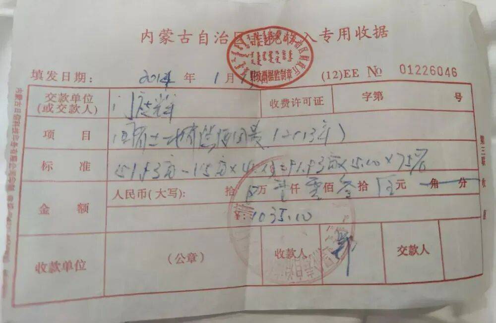 ▲2014年,老门缴纳国有土地有偿使用费的票据,收款单位为托扎敏乡乡政府。 新京报记者 赵敏 摄