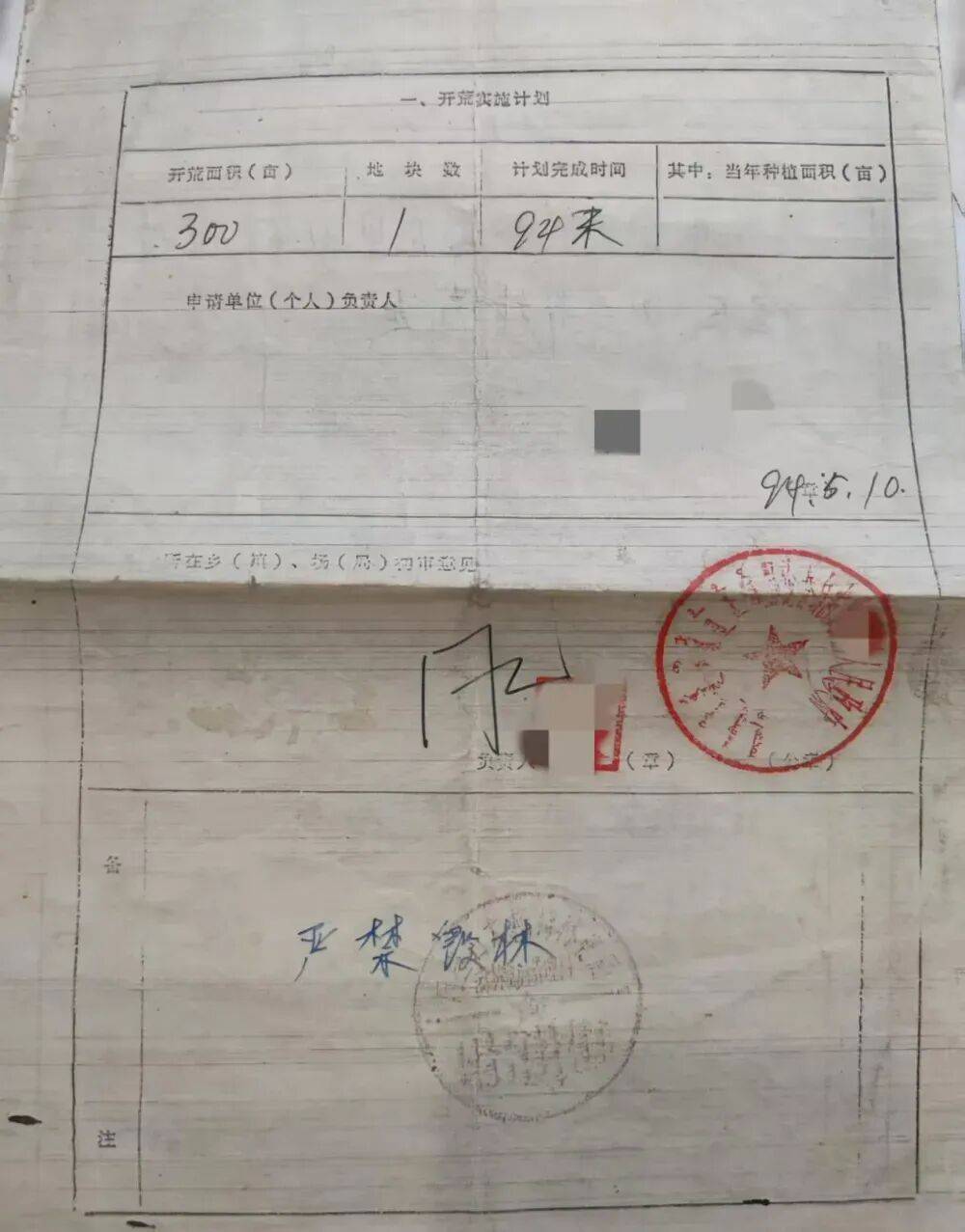 1994年,代玉曾以村集体开荒的名义拿到一份开荒审批表,上面有从乡到市各级政府及土地管理机关,以及大杨树林业局的盖章。审批表上给出了经纬度、亩数,对开荒地块植被、坡度、森林郁闭度等要求,还有“严禁毁林”的备注。