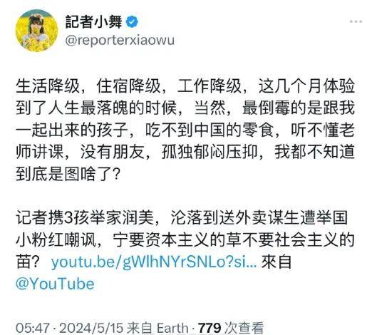 又过了一个多月,润人又在美国的网络上感叹他的生活降级、住宿降级、工作降级,体验了几个月人生最落魄的时候,感叹跟他一起润美的3个孩子吃不到零食、听不懂老师讲课,没有朋友而孤独郁闷压抑,感叹他不知道自己图啥。可最后居然还能说出“宁要资本主义的草不要社会主义的苗”的殖奴话。