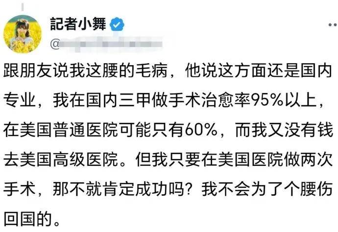 而且润人还有腰病,本来他在国内治疗的话,有九成五治愈的可能。可是在美国却只有六成。可笑的是,润人居然和对岸那个于北辰一样,扬言在美国做两次手术就成功了。然后还强调不会为了腰而回国治疗。