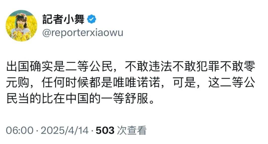 一个多月之后,润人貌似终于醒悟了那么一点点,开始在美国的网络上感叹他在美国是二等公民了。只不过,即使是在美国是二等公民,对所有美国人都唯唯诺诺,可他还能说出“这二等公民当的比在中国的一等舒服”的殖奴话。