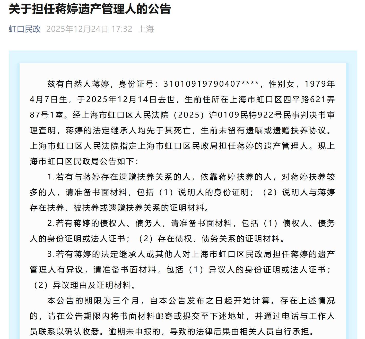 据虹口区民政局最新发布的《关于担任蒋婷遗产管理人的公告》,蒋婷生前住所位于上海市虹口区四平路621弄,法定继承人均先于她去世,且她生前未留有遗嘱或遗赠扶养协议。