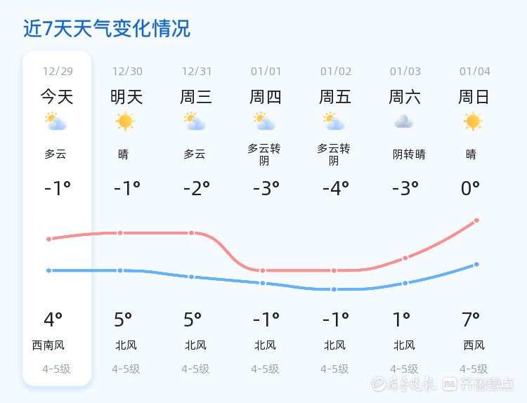明日(12月30日),威海市天气将转晴,气温略有下降,低温-1℃,高温5℃,北风4-5级。与今日相比,明日天气更加晴朗,但风力稍有增强,市民需注意防范大风带来的不便,尽量减少在风口处长时间停留。