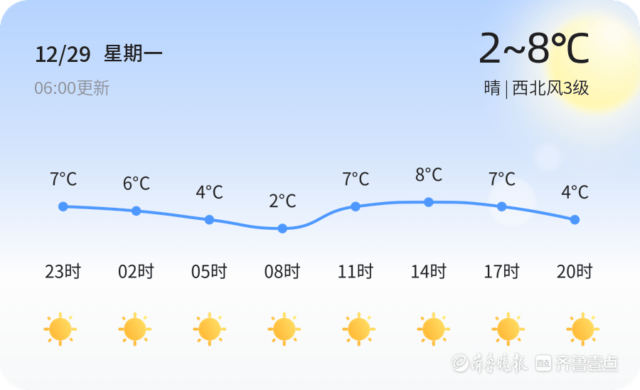 今天是2025年12月29日,星期一,农历十一月初十。青岛市迎来晴好天气,气温在2℃到8℃之间,西北风3级,空气湿度为82%。当前空气质量为轻度污染,建议市民外出时佩戴口罩,同时注意保暖,适时增减衣物。由于天气晴朗,阳光较强,建议市民外出时涂抹防晒霜或佩戴遮阳帽,以保护皮肤健康。此外,风力适中,市民出行时需注意安全,避免在广告牌或大树下逗留。未来三天,青岛市将持续晴好天气,气温略有波动。预计12月30日和12月31日,气温分别为1℃到8℃和0℃到7℃,天气晴朗,风力3-4级。1月1日,天气转为多云,气温有所下降,最低气温将达到-2℃。市民需密切关注天气变化,及时增减衣物,特别是早晚温差较大,建议老年人和儿童注意保暖,预防感冒等呼吸道疾病。温馨提示
