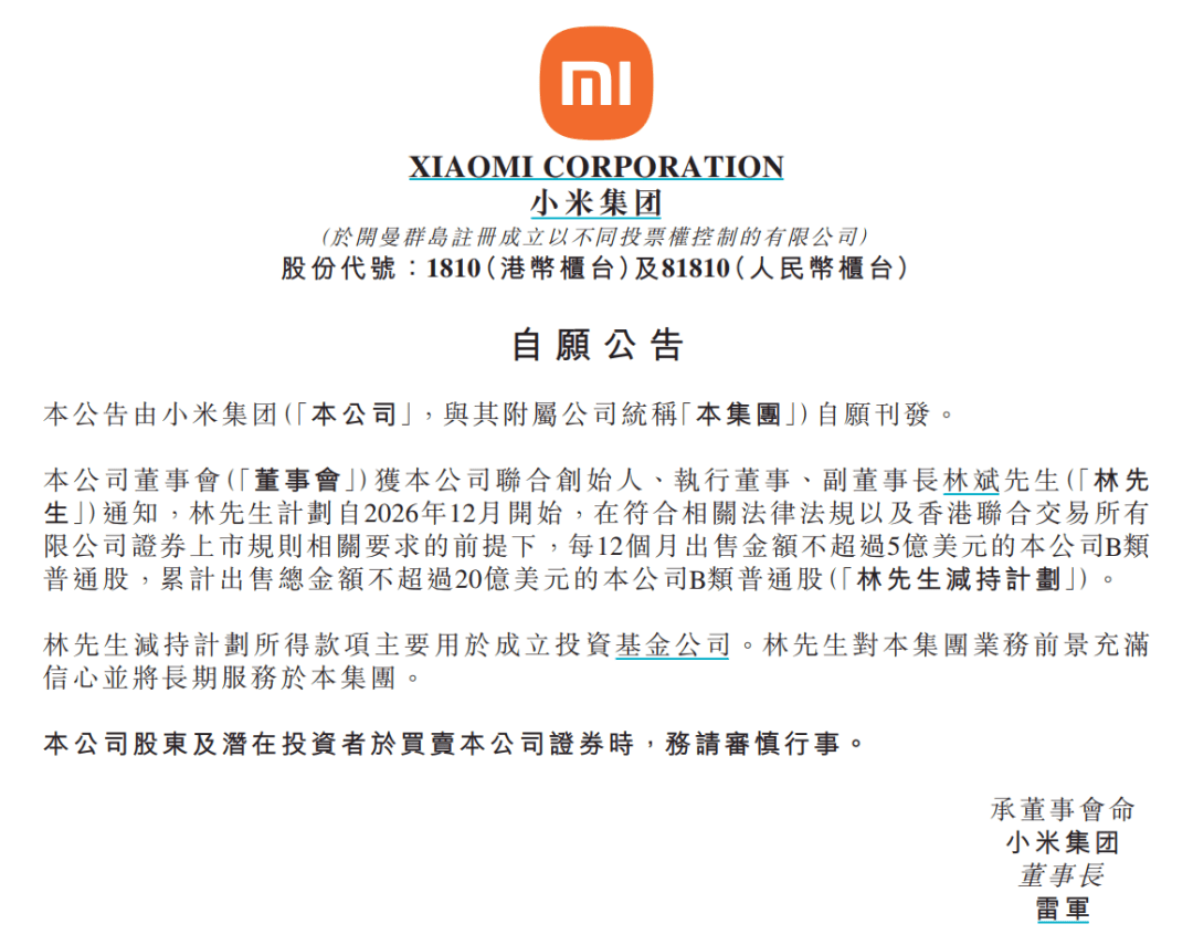 12月28日晚间,小米集团突然公告,公司联合创始人、执行董事、副董事长林斌计划自2026年12月开始,每12个月出售金额不超过5亿美元的公司B类普通股,累计出售总金额不超过20亿美元。林斌表示对集团业务前景充满信心并将长期服务于集团。林斌减持计划所得款项主要用于成立投资基金公司。