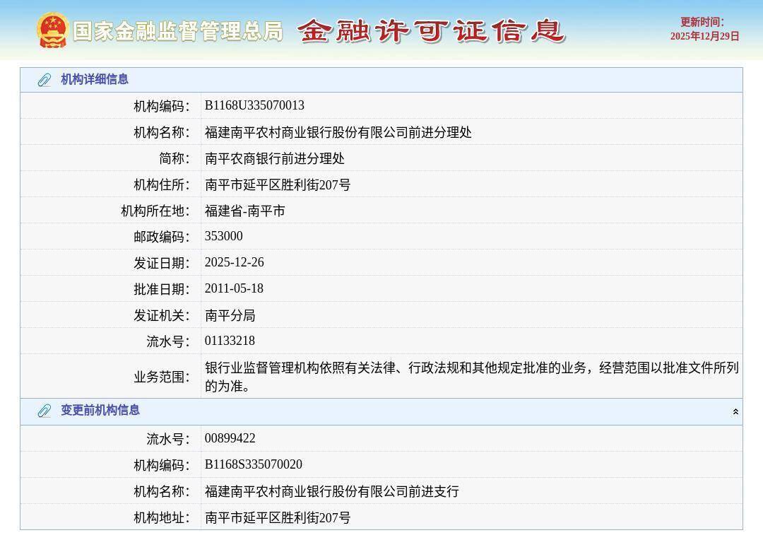 12月29日,根据国家金融监管总局许可证信息查询平台,福建南平农村商业银行股份有限公司前进分理处换发金融许可证,发证日期2025年12月26日。