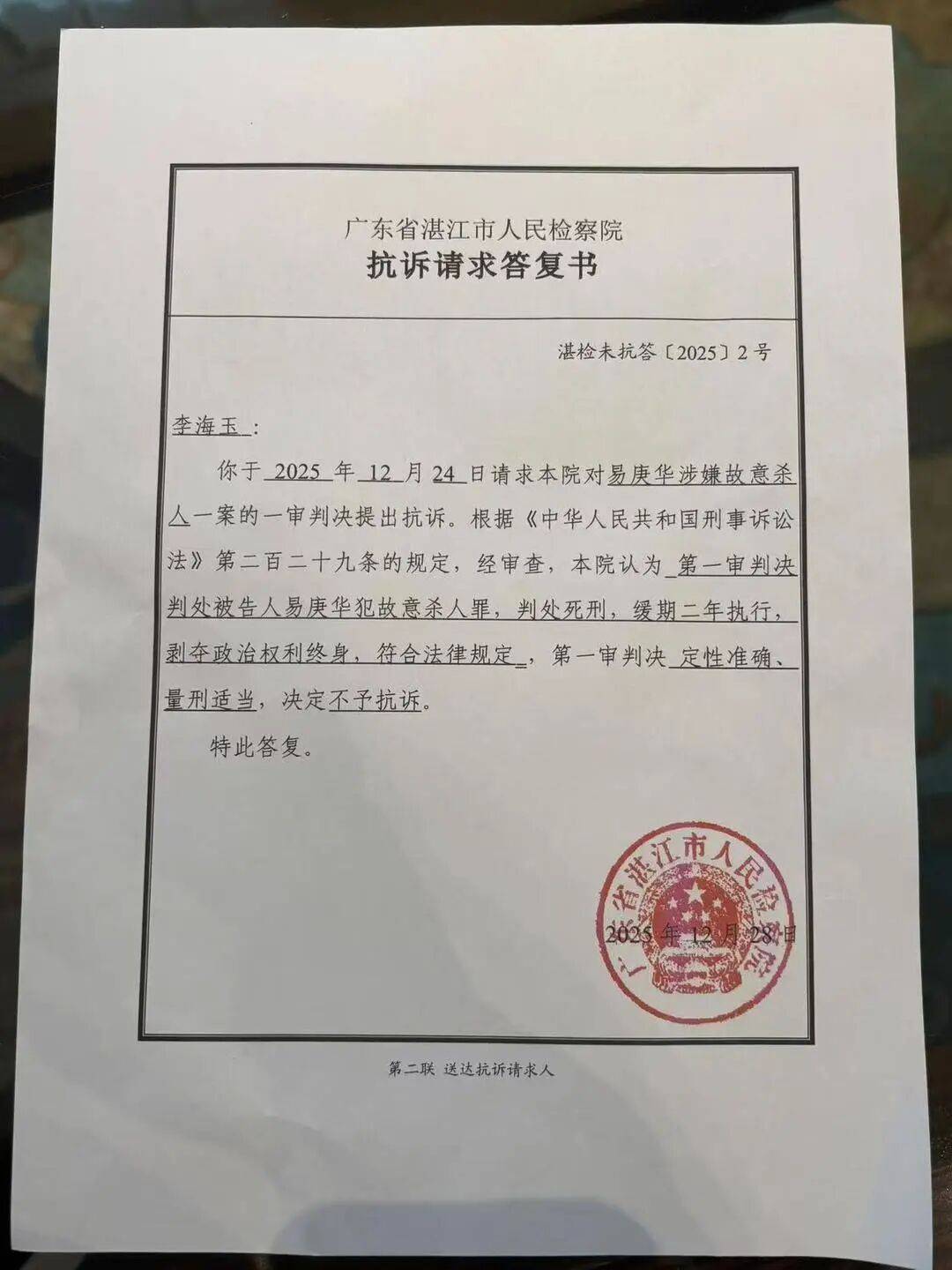 12月28日,湛江市检察院做出答复,认为根据《中华人民共和国刑事诉讼法》第二百二十九条的规定,经审查,本院认为第一审判决判处被告人易庚华犯故意杀人罪,判处死刑,缓期二年执行,剥夺政治权利终身,符合法律规定,第一审判决定性准确,量刑适当,决定不予抗诉。