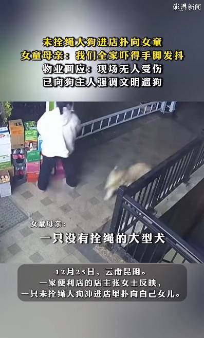 12月25日,云南昆明一家便利店的店主张女士反映,一只未拴绳大狗冲进店里扑向自己女儿。张女士表示,考虑到狗主人一方的情况暂未报警,发视频主要是希望大家遛狗请拴绳。