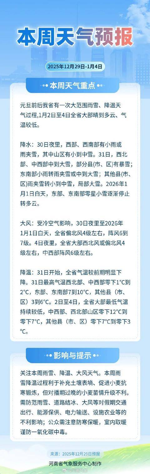 伴随雨雪而来的,是气温的“跳水”。全省大部分地区气温将下降6到8℃,中西部降幅达8到10℃。举个具体的例子,三门峡市1月1日的最高气温预计仅有-2℃,这还没算上4级左右、阵风6到7级的偏北风带来的风寒效应。体感温度会比数字更低。