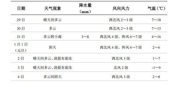1月2日多云间晴天,清晨会出现霜冻,西北风3级,气温1℃至7℃;