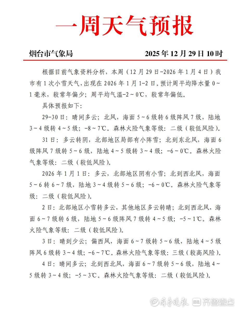 12月29日10时,烟台市气象局发布最新一周天气预报。根据目前气象资料分析,本周(2025年12月29日—2026年1月4日)烟台市有1次小雪天气,出现在2026年1月1日至2日。预计周平均降水量0~1毫米,较常年偏少;周平均气温-2~0℃,较常年偏低。