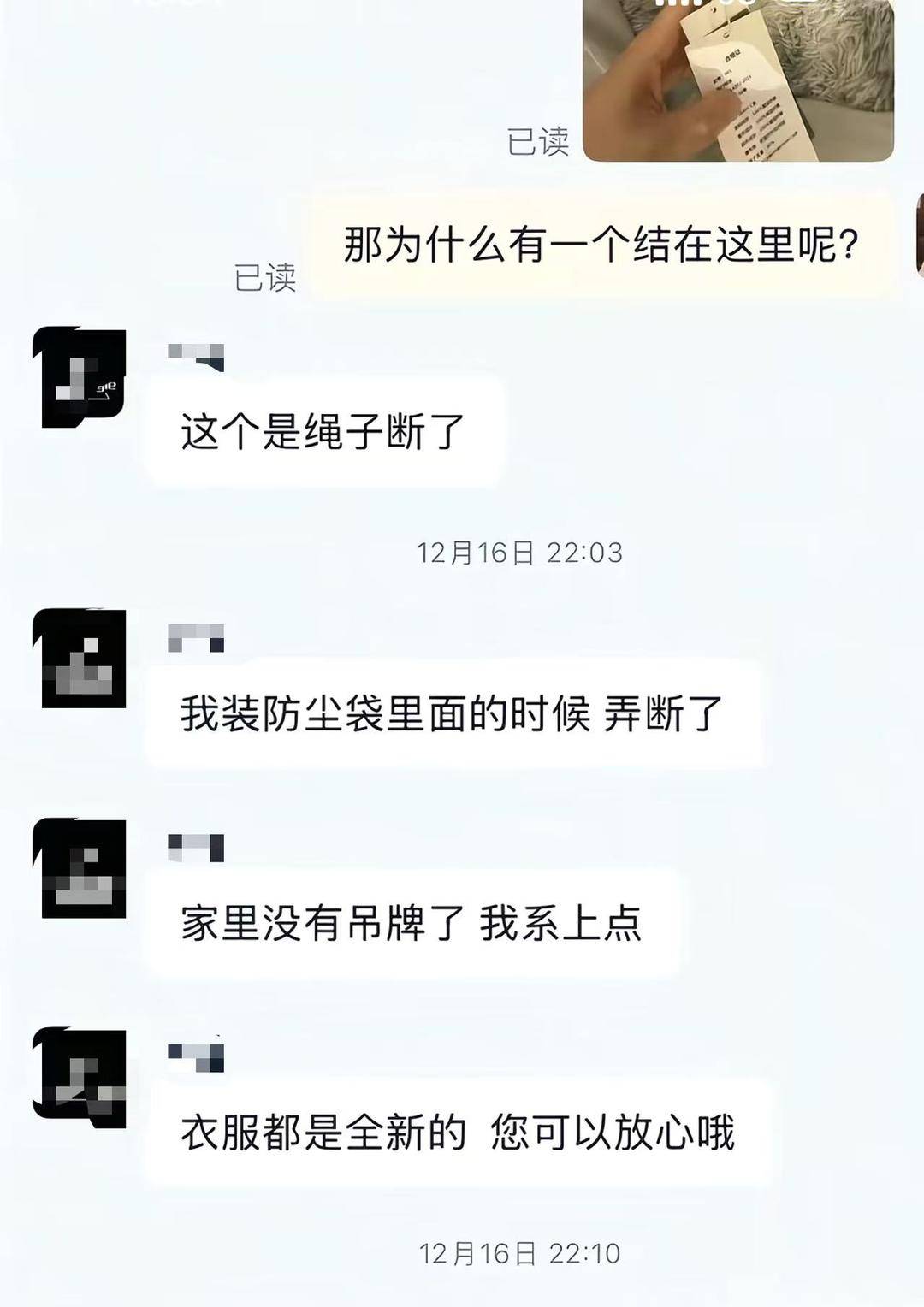 对此,红星新闻试图私信该账号但始终未获回复,12月29日下午2时许,记者发现,该账号此前发布的回应作品在主页均已不见。据《正在新闻》报道,苏女士表示,自己花633元在淘宝某商家处购买羽绒服,12月16日收货,她发现羽绒服吊牌有打结,疑似是退换货商品二次销售。她询问商家是否是二次销售,对方否认。苏女士称她带着羽绒服从三亚前往哈尔滨,落地时穿上羽绒服,把登机牌顺手装入口袋,“我只穿过一次,是从机场到酒店路上,然后再没有穿过。”返回三亚后,于12月24日将羽绒服寄出,要求退货退款,商家后台同意。