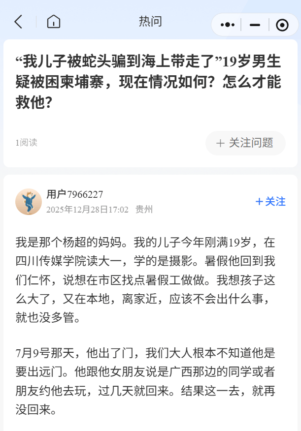 后来发生的事情,远远超过了翁女士的预期。儿子并没有留在仁怀市城区,而是先到了遵义,再去了广西,最后经防城港、东兴等地去了国外。为了找回儿子,翁女士通过腾讯新闻热问等平台大量发布了寻人启事。