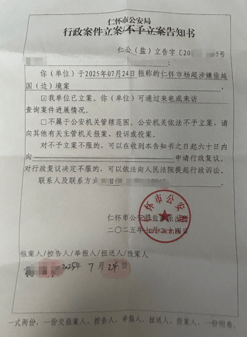 潇湘晨报记者获取的一份《立案告知书》显示,7月24日,仁怀市公安局盐津派出所对杨超涉嫌偷越国(边)境案进行了立案。