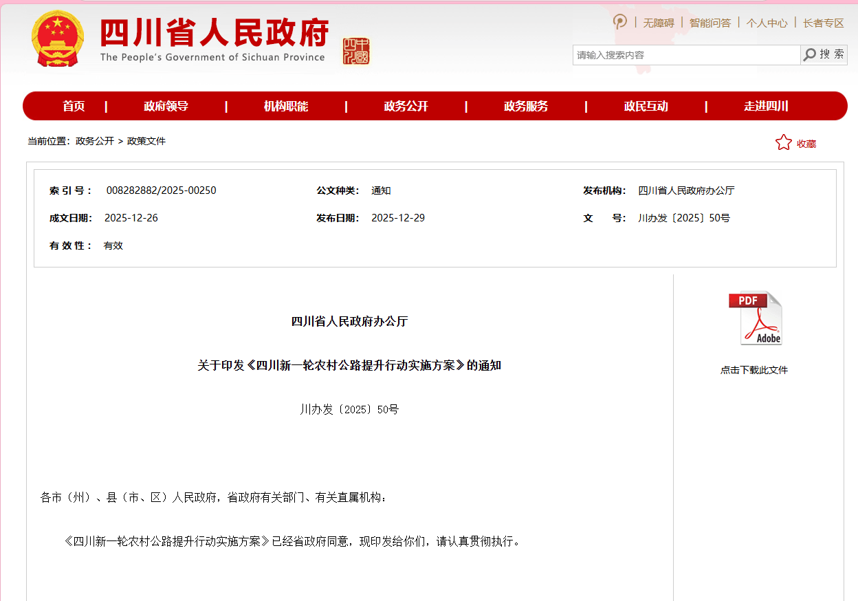 ▲四川省人民政府官网发布《四川新一轮农村公路提升行动实施方案》