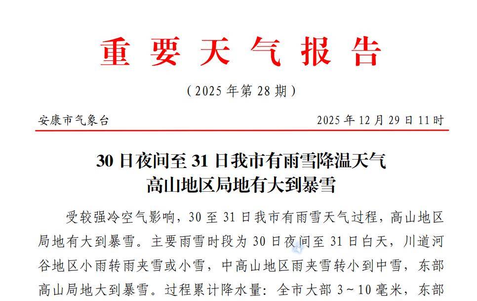 主要雨雪时段为30日夜间至31日白天,川道河谷地区小雨转雨夹雪或小雪,中高山地区雨夹雪转小到中雪,东部高山局地大到暴雪。