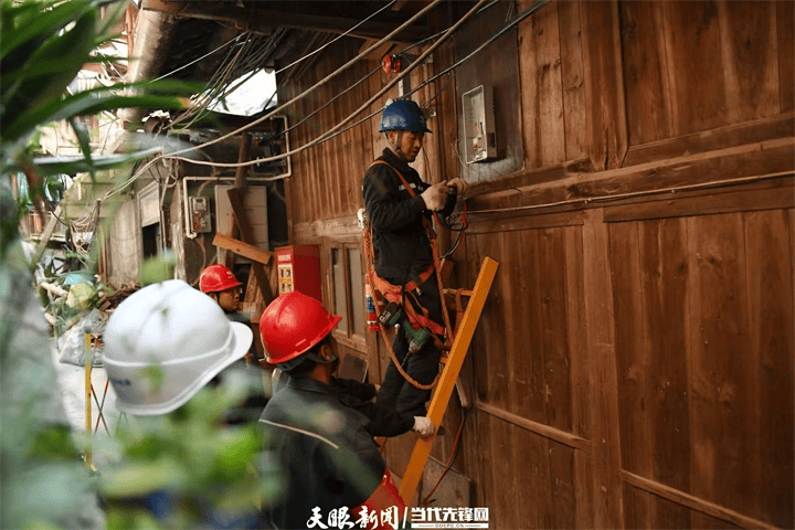 冬日黄昏,黔东南州黎平县肇兴侗寨,崭新的消防管网悄然延伸,改造后的电线被绝缘管包裹着,一旁的红灯笼次第亮起;在黔南州都匀市匀东镇坝固社区坡脚寨,木楼檐角下,新架设的绝缘线路排列得规整有序,尽显清爽。