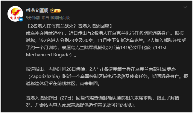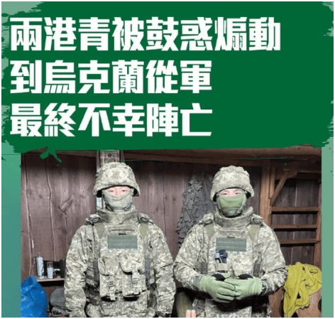 报道还称,除了这两名死在乌克兰战场上的两名港人之外,还有两名港人也在乌克兰参战。