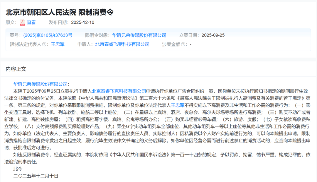 据天眼查官网显示,近日华谊兄弟旗下两家核心公司华谊兄弟电影有限公司、华谊兄弟传媒股份有限公司及其法定代表人王忠磊、王忠军被北京市朝阳区人民法院限制高消费,涉及7473万元执行案件。