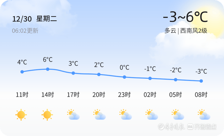 今天是2025年12月30日,星期二,农历十一月十一。烟台市今日天气多云,气温范围在-3°C到6°C之间,当前温度为-0.7°C,西南风2级,空气湿度65%,PM2.5指数52,空气质量良好。各区天气总体以晴朗为主,部分地区有云,风力较小,适合市民户外活动。