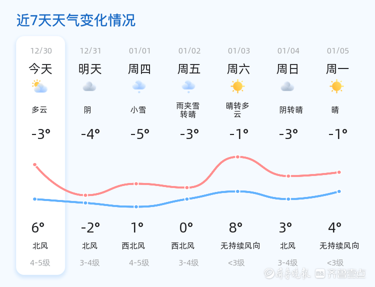 未来三天,烟台市天气变化较大。12月31日,阴天,气温在-4°C至-2°C之间;1月1日,小雪,气温-5°C至1°C;1月2日,雨夹雪转晴,气温-3°C至0°C。期间,市民需特别注意防范雨雪天气可能导致的道路湿滑,出行时请减速慢行,确保安全。