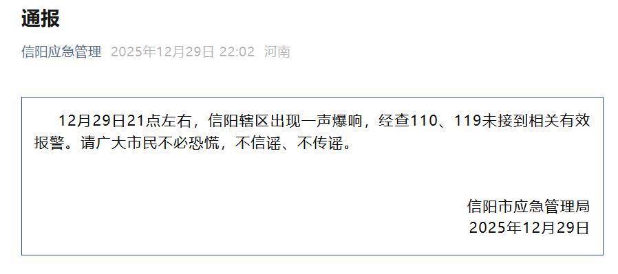 据信阳市应急管理局发布官方通报:12月29日21时左右,信阳辖区出现一声爆响,经查110、119未接到相关有效报警。请广大市民不必恐慌,不信谣、不传谣。