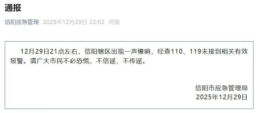 河南信阳市应急管理局通报,12月29日21时左右,信阳辖区出现一声爆响,经查110、119未接到相关有效报警。请广大市民不必恐慌,不信谣、不传谣。