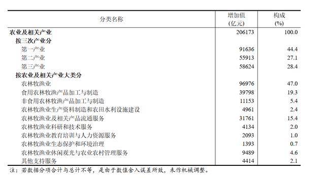 从农业及相关产业大类看,农林牧渔业、食用农林牧渔产品加工与制造、农林牧渔业及相关产品流通服务增加值规模居前三,占农业及相关产业增加值的比重分别为47.0%、19.3%、15.4%。
