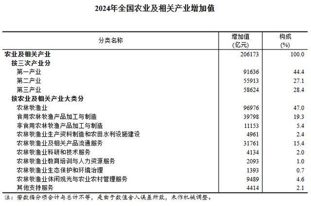 人民网北京12月30日电 (记者杨曦)国家统计局今日公布数据显示,经核算,2024年全国农业及相关产业增加值为206173亿元,占国内生产总值(GDP)的比重为15.29%。