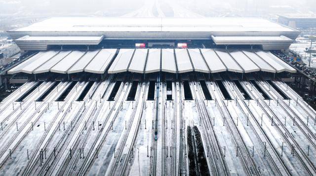12月12日,一辆高铁从大雪覆盖下的郑州东站驶出。潘超 摄