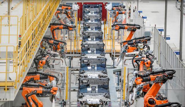 比亚迪郑州航空港工业园焊装工厂全自动化生产线正在进行下车身焊接作业