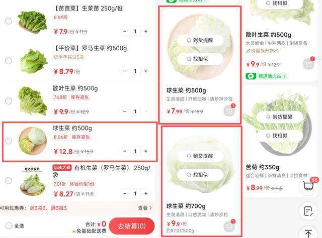 相比于前两天,叮咚买菜已有部分生菜价格回落|图源:叮咚买菜截图