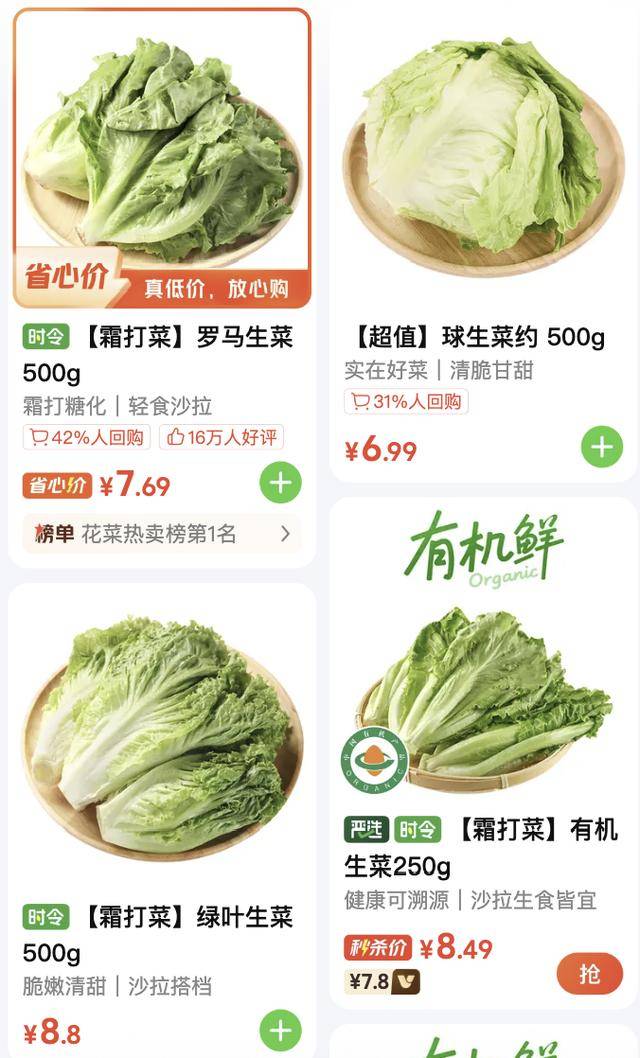 相比之下,小象超市的生菜售价较低,球生菜为6.99元/斤,【霜打菜】罗马生菜和【霜打菜】绿叶生菜价格分别为7.69元/斤、8.8元/斤。【霜打菜】有机生菜贵一些,非会员价为16.98元/斤。