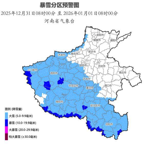 河南省气象台2025年12月30日17时00分发布暴雪蓝色预警:预计31日08时到2026年1月1日08时,安阳西部、新乡西部、焦作北部、济源、三门峡、洛阳、郑州中西部、平顶山、许昌、漯河、周口西部、南阳、驻马店、信阳将出现5毫米以上降雪,其中三门峡西部、洛阳南部、南阳南部、驻马店西部、信阳南部局部将出现10毫米以上降雪,请注意防范。上述地区的相邻县(市、区)也需关注。
