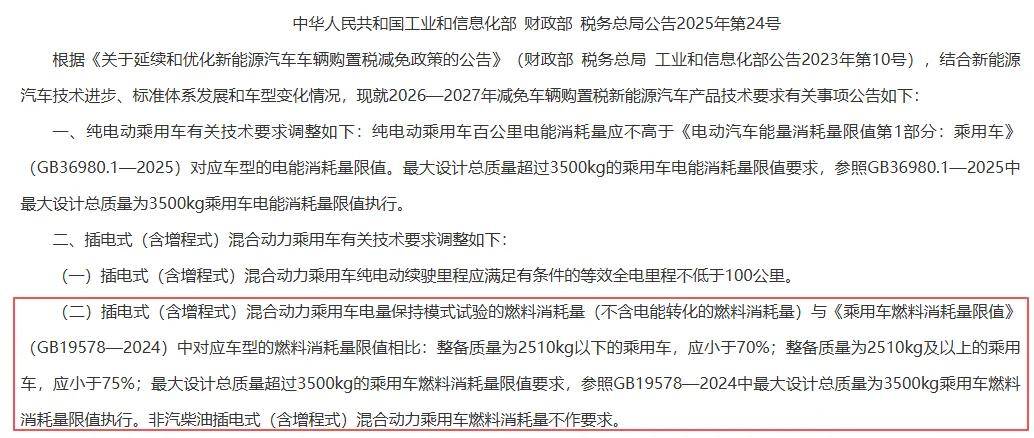 《关于2026—2027年减免车辆购置税新能源汽车产品技术要求的公告》关于混动车亏电油耗的相关规定,来源:国税总局