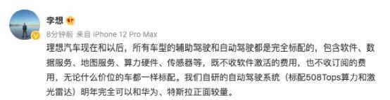 但这并不影响“微博大王”李想打嘴炮。2021年4月,李想在微博上表示理想在2022年智能驾驶技术可以和华为、特斯拉正面较量。