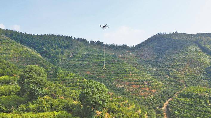 在湖南益阳南县明山头镇,农业无人机将油茶果从种植基地吊运至山脚。新华社发