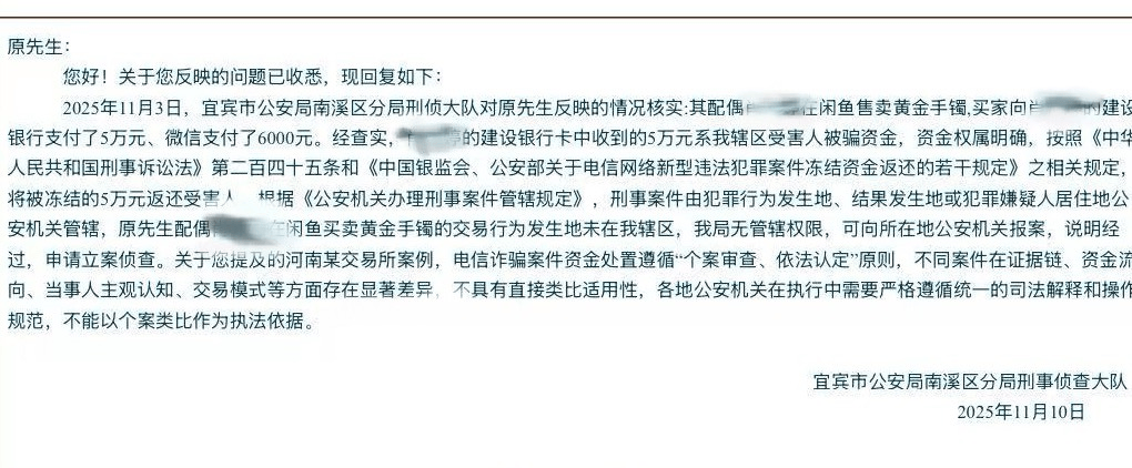原晓的遭遇便是一个典型案例。当他援引河南某粮食商28万元资金被冻结后成功解冻的案例,向宜宾警方提出异议时,得到的回复是:电信诈骗案件的资金处置遵循“个案审查、依法认定”原则,不同案件在证据链完整性、资金流向、当事人主观认知、交易模式等方面均存在差异,不具有直接类比适用性。