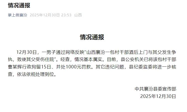 新京报讯 据掌上微襄汾消息,12月30日,一男子通过网络反映“山西襄汾一包村干部酒后上门与其父发生争执,致使其父受伤住院”。经查,情况基本属实。目前,县公安机关已将该包村干部曹某辉行政拘留15日、并处1000元罚款。其它违纪问题,县纪委监委将进一步核查,依法依规处理到位。