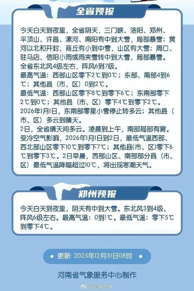 据@河南气象,今天白天到夜里,全省阴天,三门峡、洛阳、郑州、平顶山、许昌、漯河、南阳有中到大雪,局部暴雪;黄河以北和开封、商丘有小到中雪,山区有大雪;周口、驻马店、信阳小雨或雨夹雪转中到大雪,局部暴雪。注意防范道路湿滑、低能见度等对假期出行的影响。