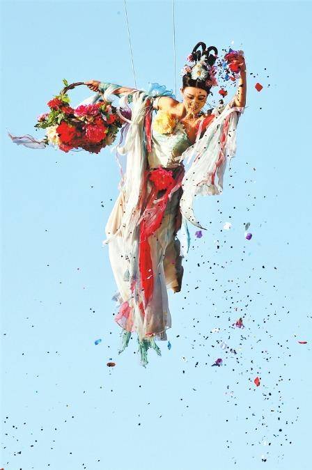 演员在洛阳市洛邑古城景区表演天女散花。河南日报记者 王铮 摄