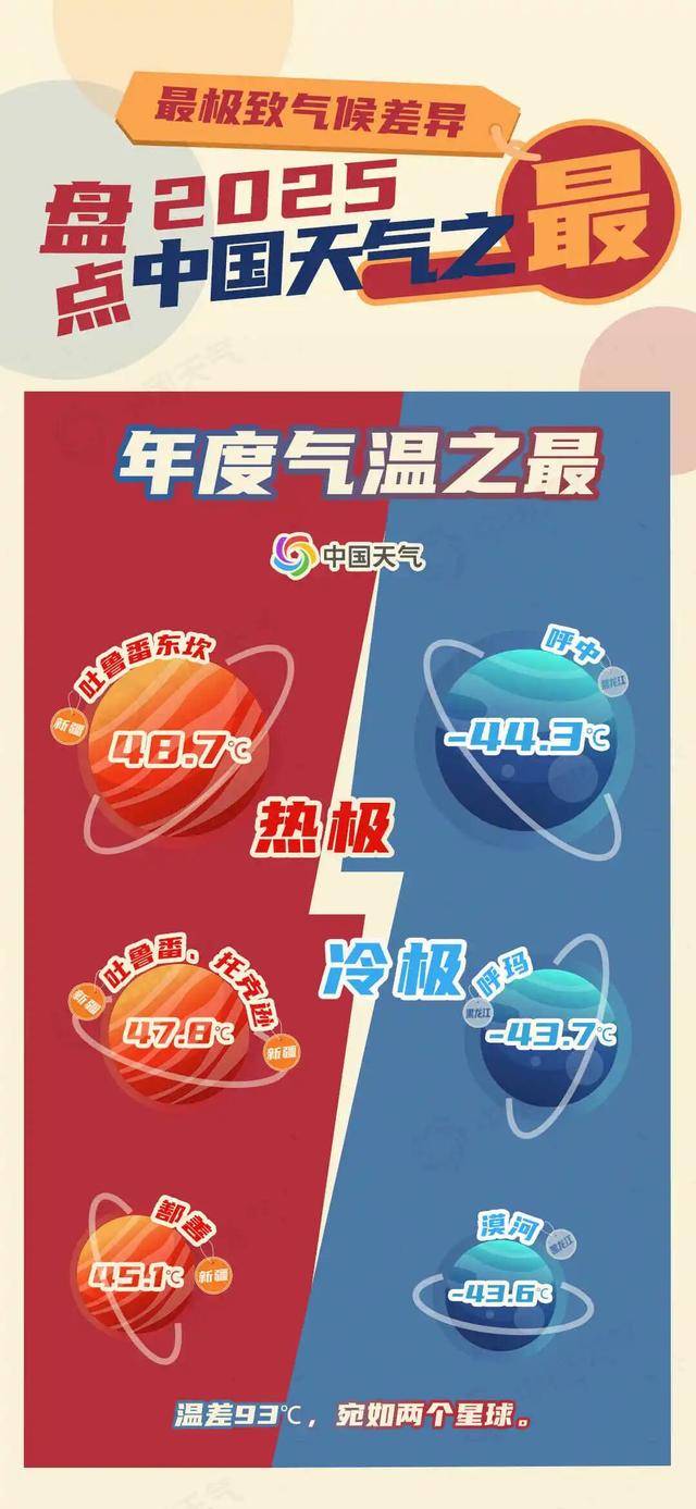我们的脚下是一片辽阔的土地。这里背靠世界最大大陆,又濒临世界最大大洋,由此酝酿出世界上最发达的季风区域之一。这里是中国,最极致的气候差异,可能不在你熟悉的城市,而是某个小镇、小岛,甚至某个你从未听过的远方。2025年末,中国天气网盘点全国2429个国家级气象观测站的天气数据,带你探寻过去一年里那些中国天气之“最”。