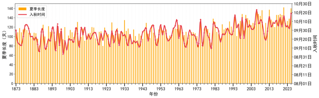 2025年的夏季长达160天,仅次于2021年的162天,位列1873年来的第二。“超长待机”的夏季也直接导致10月19日才入秋,成为有气象记录以来第二晚的入秋年份。