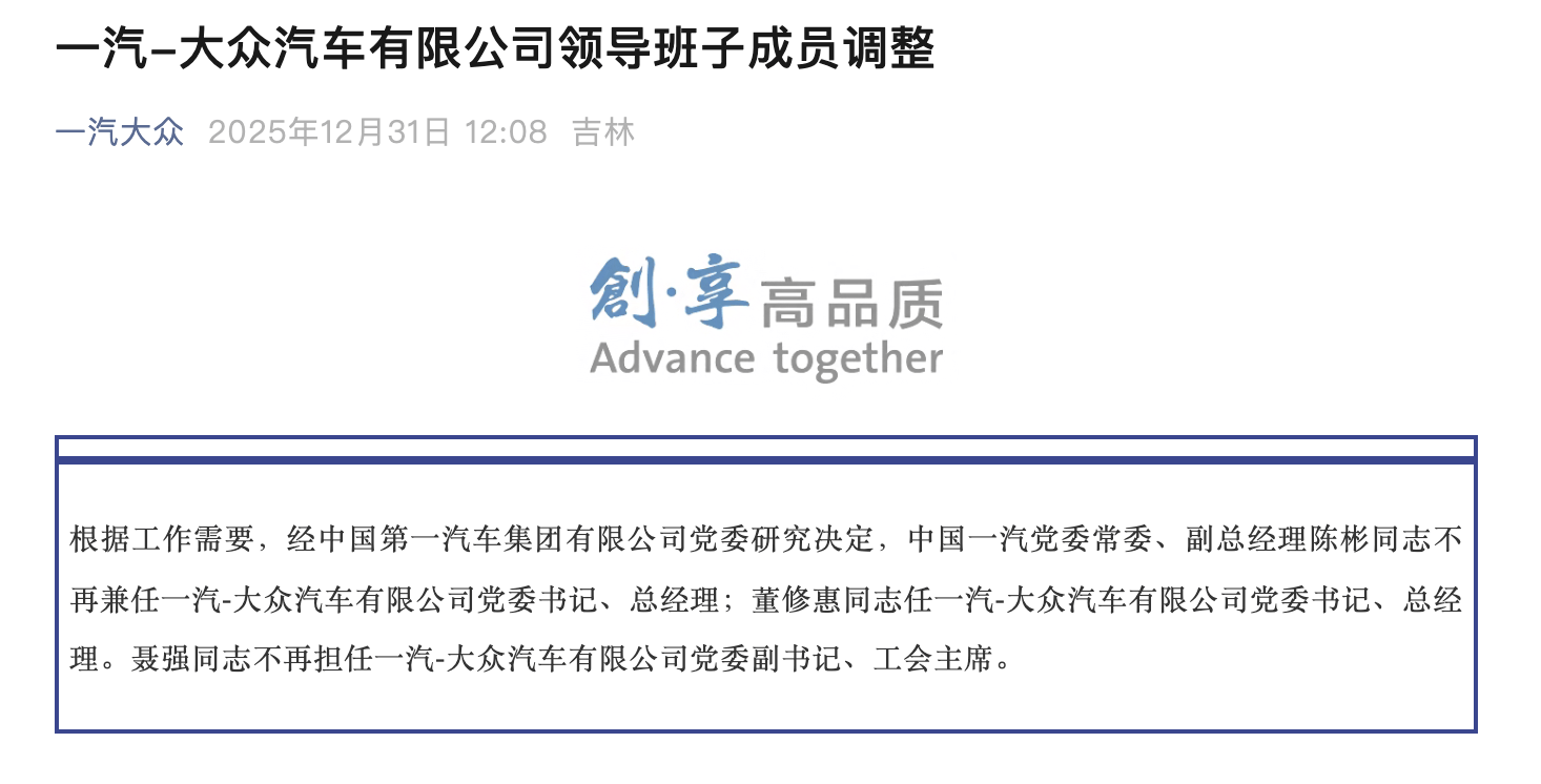网通社·快讯12月31日,一汽-大众汽车有限公司领导班子成员调整。中国一汽党委常委、副总经理陈彬不再兼任一汽-大众汽车有限公司党委书记、总经理;董修惠任一汽-大众汽车有限公司党委书记、总经理。聂强不再担任一汽-大众汽车有限公司党委副书记、工会主席。