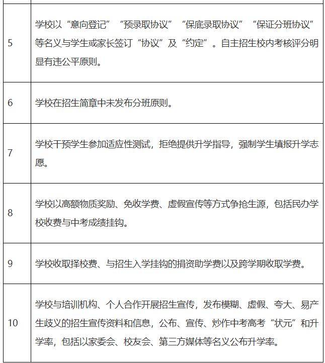 此外,《清单》要求学校必须在招生简章中发布分班原则;禁止学校干预学生参加适应性测试,拒绝提供升学指导,强制学生填报升学志愿;禁止学校以高额物质奖励、免收学费、虚假宣传等方式争抢生源,包括民办学校收费与中考成绩挂钩;禁止学校收取择校费、与招生入学挂钩的捐资助学费以及跨学期收取学费等。